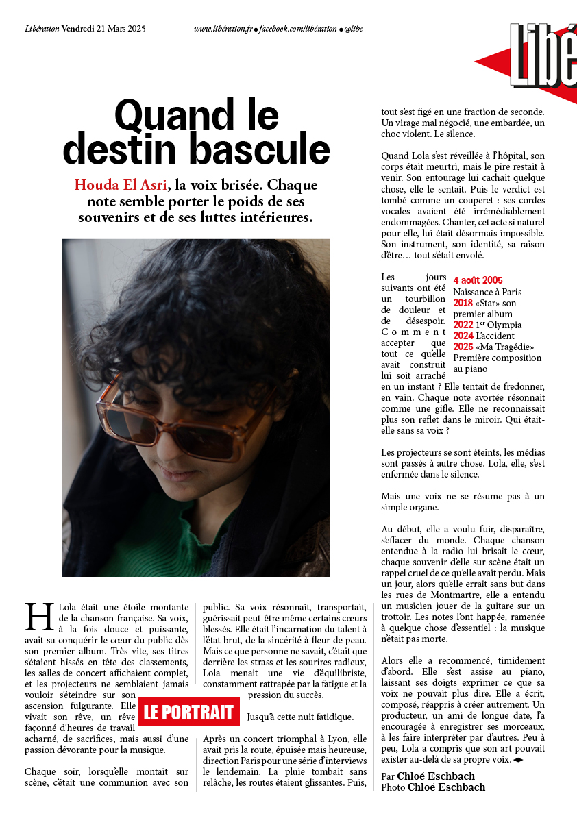 J’ai choisi de créer trois univers totalement différents. Pour Libération, je souhaitais quelque chose de brut : une photographie en extérieur, avec le béton des bâtiments en arrière-plan. Je recherchais une ambiance très brute, avec beaucoup de contraste.