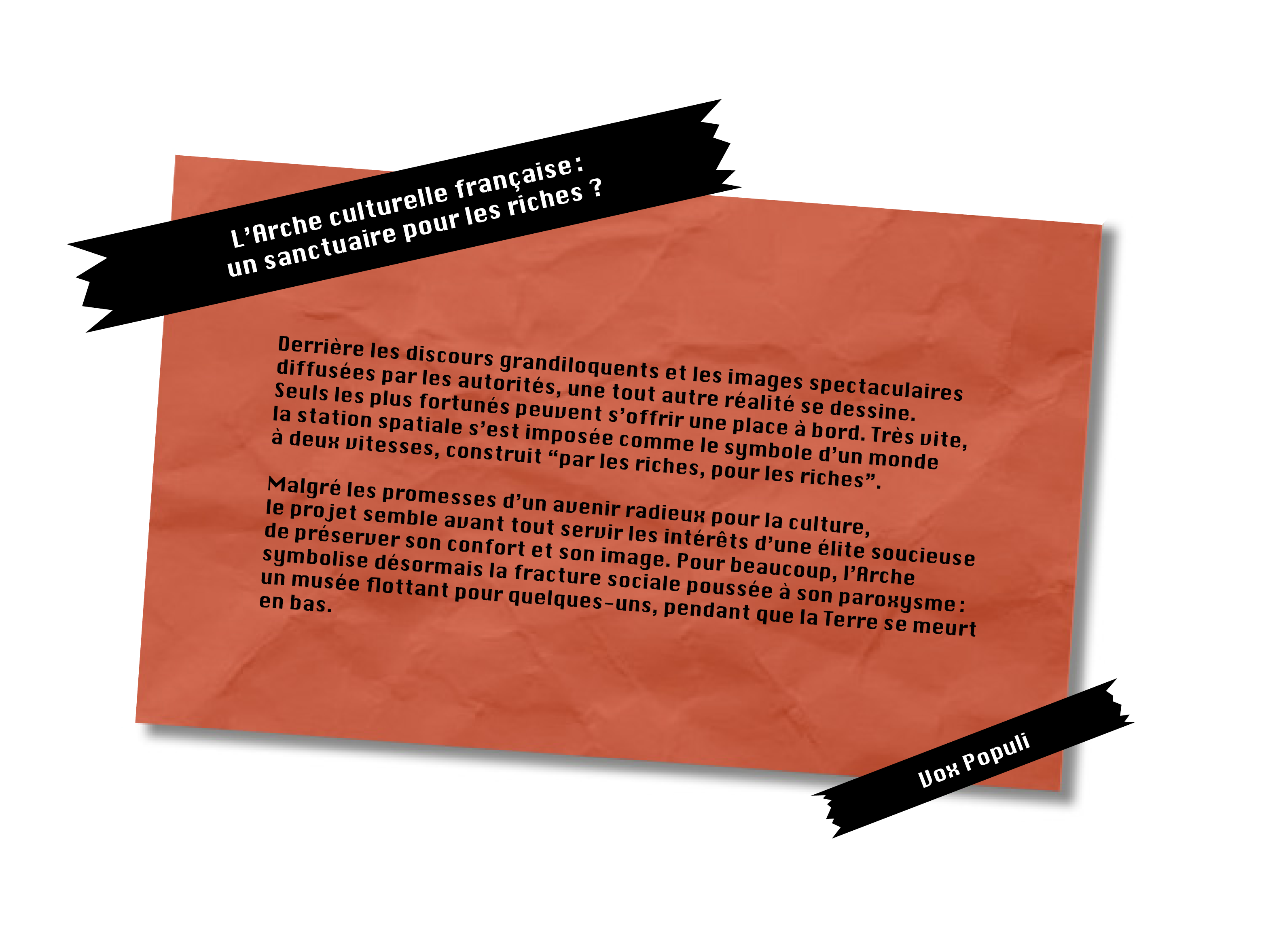 Cette technologie, extrêmement coûteuse, est réservée à une élite et entraîne la création d’un mouvement de contestation : Vox Populli, qui dénonce une culture devenue inaccessible.